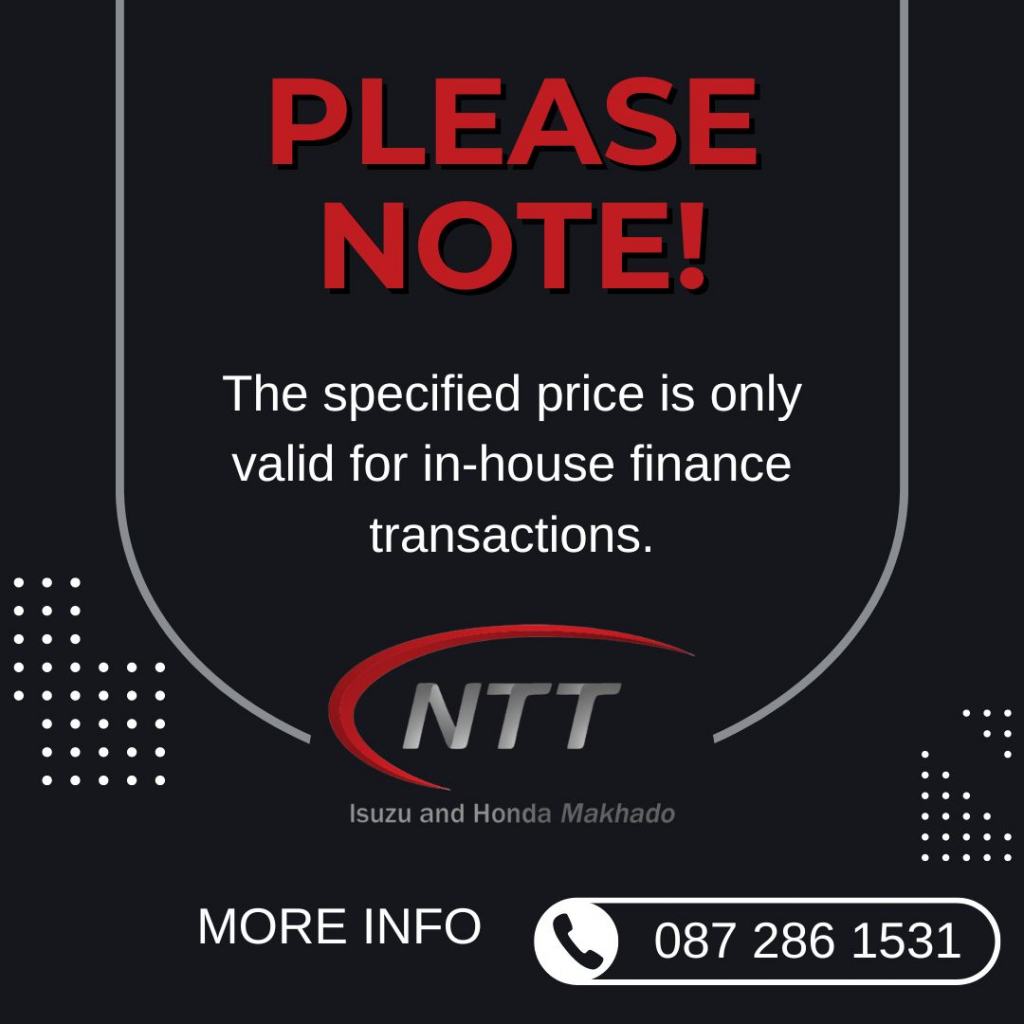 NTT Isuzu Louis Trichardt offers nationwide delivery. Expert financial advice from our experienced F I's. NTT Isuzu Louis Trichardt make use of all major banks,. A variety of value added products like Smash and Grab, Car Track, Warranties, Motor Plans are also available. NTT Isuzu Louis Trichardt are an Authorised and Approved Isuzu Dealership where all pre owned vehicles are Certified.